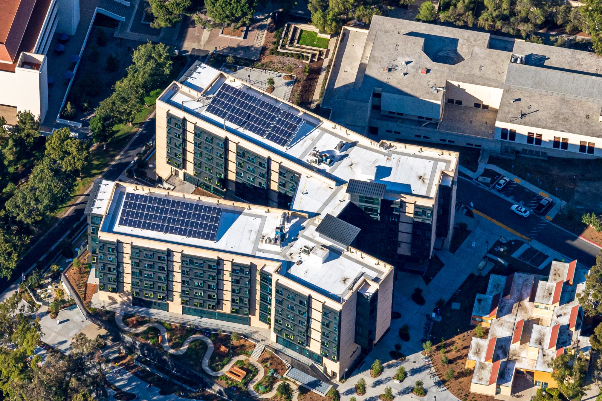 To help the campus meet its sustainability goals while accommodating a growing student population, Sullivan Solar Power was selected to install a 50 kW AC solar power system on the two Middle Earth Tower roofs. This system includes 164 high-efficiency Sunpower solar modules, as well as two 480 volt SolarEdge inverters. The installation was completed by Sullivan Solar Power’s state-certified electricians and is the company’s second solar power installation on campus following its Mesa Court project, which was completed in 2016 and was also recognized as a LEED Platinum building.