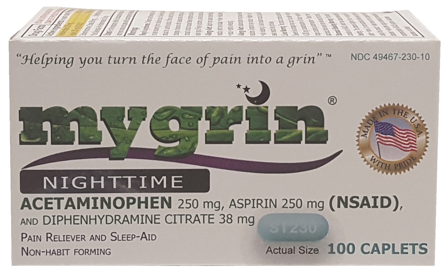 The second product is MYGRIN® Nighttime (Acetaminophen 250mg, Aspirin 250mg (NSAID), and Diphenhydramine citrate 38mg), a combination drug used for the temporary relief of occasional headaches, and minor aches and pains, with accompanying sleeplessness. MYGRIN® Nighttime contains less than the typical single dose of most NSAIDs in each caplet.11 It also contains a less than the typical single dose of Acetaminophen, a centrally acting analgesic and antipyretic, in each caplet.12 By providing a combination of two common pain relievers at a less than typical single dose, a patient/consumer will be able to help relieve their pain and likely reduce long term complications caused by the chronic use of NSAIDs, or Acetaminophen, alone. Complementary to our internal research and development activities, published clinical studies have shown that the combination of Acetaminophen and Aspirin is effective in the reduction of pain intensity for patients.13-15 Moreover, published studies have shown that acute and chronic pain causes cognitive impairment.16,17 Additionally, sleep deprivation is also known to adversely affect the brain, its cognitive function, and influence other health problems.18-21 “Insomnia is by far the most common sleep disorder in headache patients.”22 Therefore, the need for a good night’s rest is harmonious to sufficient pain relief. Lastly, the addition of Diphenhydramine citrate, a non-addictive sleep aid, in MYGRIN® Nighttime creates an excellent combination of three active ingredients to help the patient/consumer alleviate their pain, as well as helping them fall asleep.