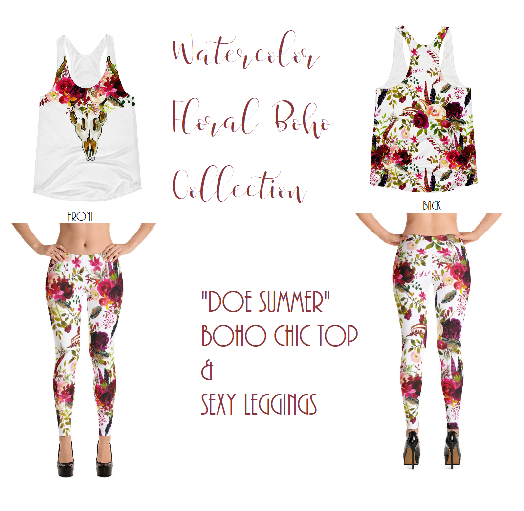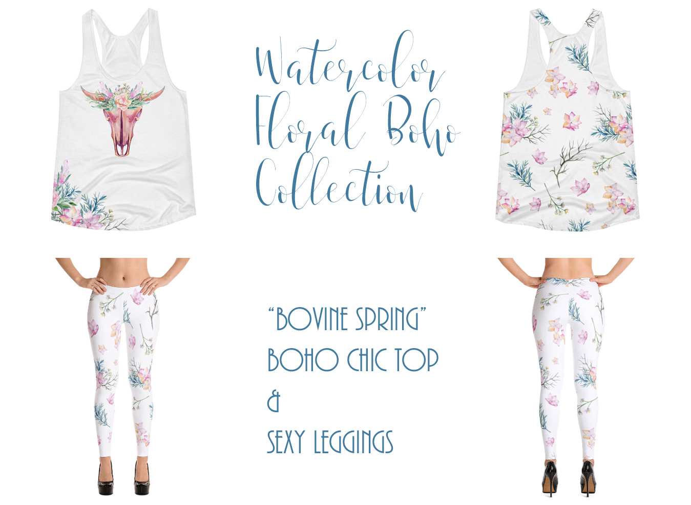 Her collection includes soft leggings and matching tanks. Each individual collector’s piece has its own name, from Summer to Spring. The Watercolor Floral Boho Collection pieces range in price from $30 to $45.