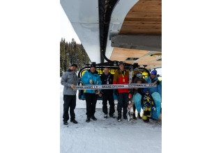 Prior to the boarding of the first chair, Elders from the Chiniki, Goodstoney, and Bearspaw First Nation performed a blessing to protect the chair and thank the land. Immediately following the blessing, the ribbon was cut, and Super Angel's first chair carrying Ralph Scurfield and family members embarked on its maiden flight. This marked the start of Super Angel LX's inaugural ride with a ribbon-cutting, leading the Scurfield family up Super Angel LX's first ascent.