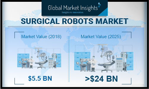 SELBYVILLE, Del., January 10, 2020 (Newswire.com) - Global Market Insights, Inc. has recently added a new report on the surgical robots market which estimates the global market valuation for surgical robots will cross US$ 24 billion by 2025. Rising patient preference towards minimally invasive surgeries in developed as well as developing economies will propel surgical robots market growth in forthcoming years. Moreover, factors such as reduced post-care discomfort, less need for blood transfusions and shorter hospital stay are some of the advantages of surgical robots that will drive the industry growth.