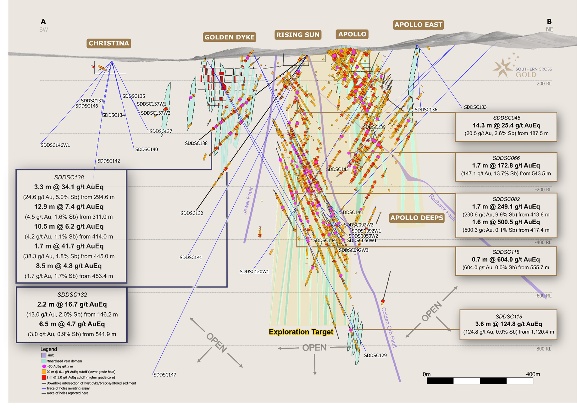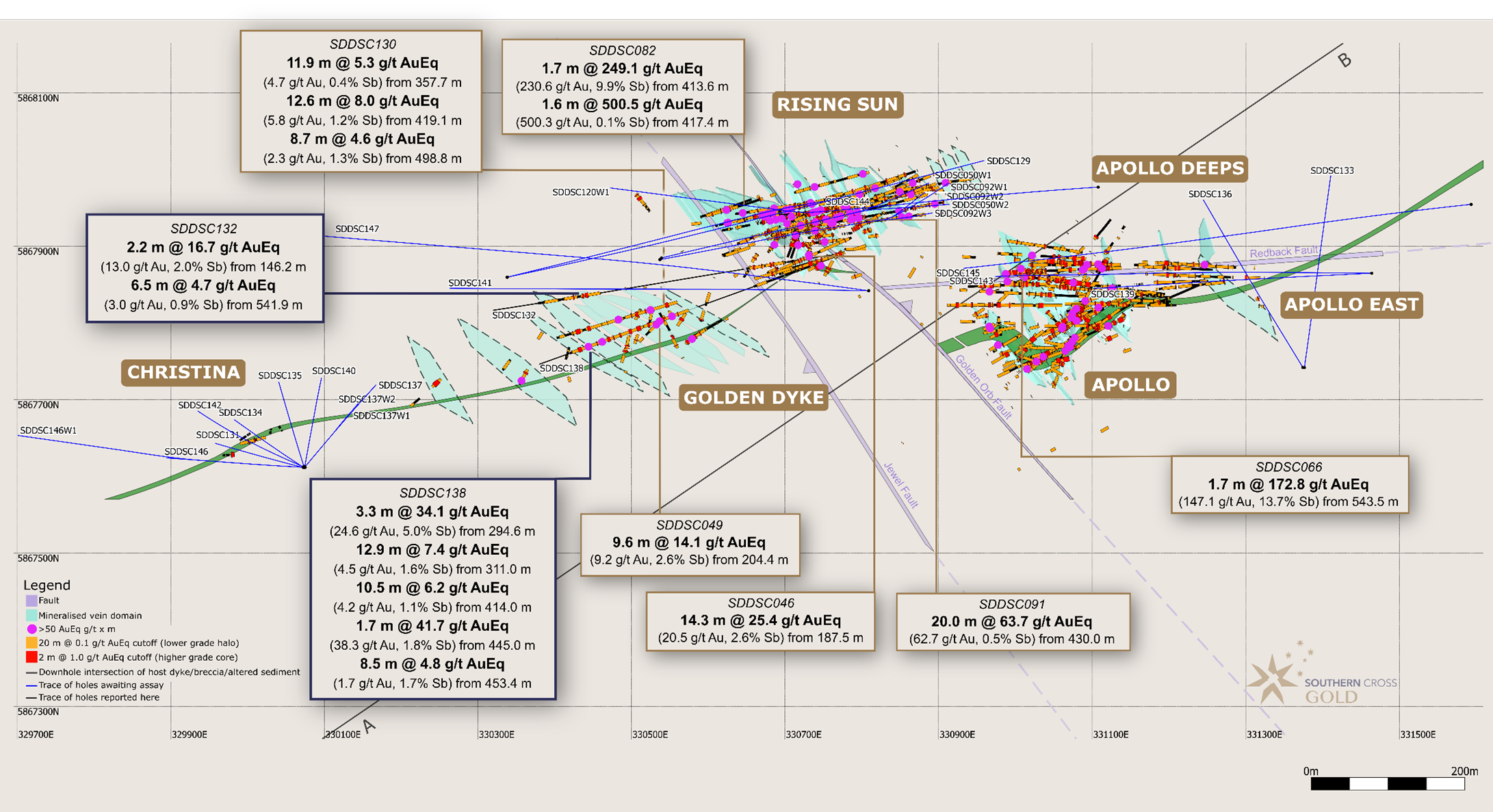 SDDSC138 was drilled east to west, parallel to and within the dyke/breccia host structure (the ladder "rails") and intercepted twelve mineralised vein sets (the ladder "rungs") across Rising Sun and Golden Dyke, while testing a prospective corridor of 292 m (cumulative downhole length of dyke and sericite/carbonate altered sediment). SDDSC138 included 15 intercepts of Au > 20 g/t (up to 183 g/t Au) and 19 intercepts of Sb > 5% (up to 33.8% Sb) . This hole drilled up to 250 m below surface and 55 m to 85 m above and parallel to SDDSC130 (reported September 05, 2024 ) which provided continuity of mineralised structures, some relatively close to surface: