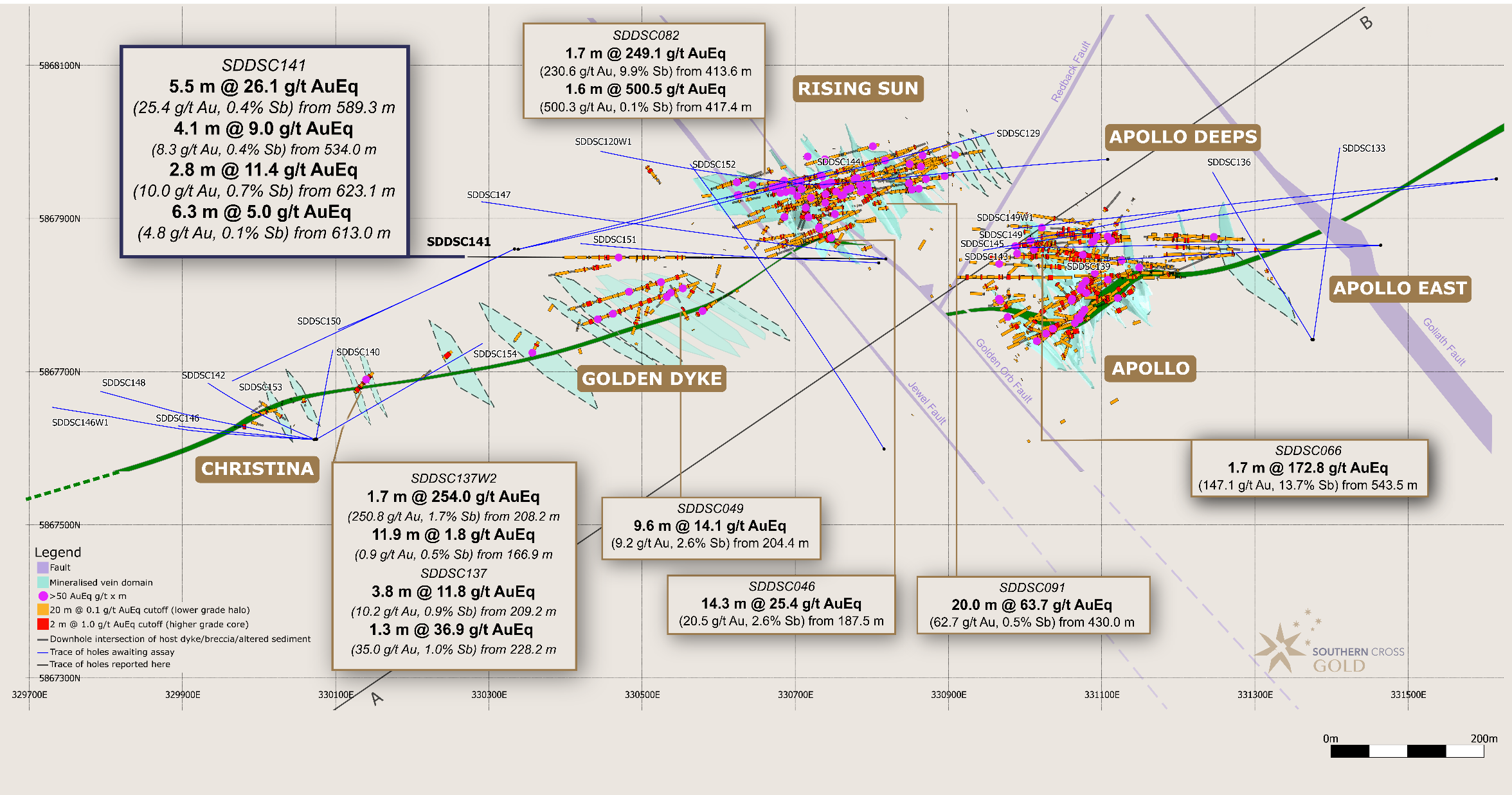 Southern Cross Gold's Sunday Creek Project Continues to Validate Its Position as One of the Most Significant Global Gold-Antimony Discoveries in Recent Years SXG's latest drilling has revealed exceptional gold grades at depth at the historic Golden Dyke mine area, supporting the growth potential of this zone, with key highlights including: