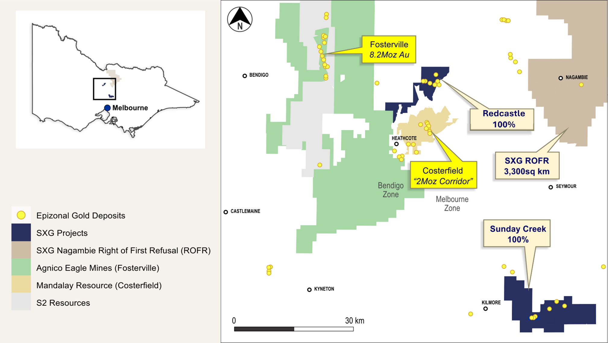 The Sunday Creek epizonal-style gold project is located 60 km north of Melbourne within 16,900 hectares of granted exploration tenements. SXG is also the freehold landholder of 133.29 hectares that form the key portion in and around the main drilled area at the Sunday Creek Project.