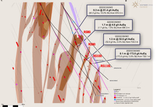 0.5 m @ 9.1 g/t AuEq (8.7 g/t Au, 0.2% Sb) from 694.1 m - RS80