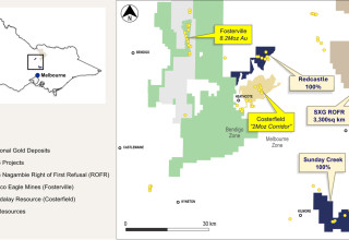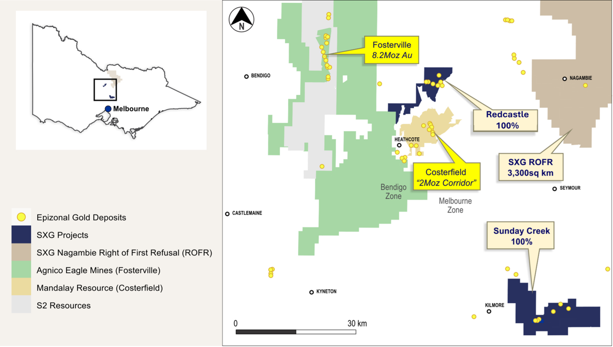 The Sunday Creek epizonal-style gold project is located 60 km north of Melbourne within 19,365 hectares of granted exploration tenements. SXG is also the freehold landholder of 133.29 hectares that form the key portion in and around the main drilled area at the Sunday Creek Project.