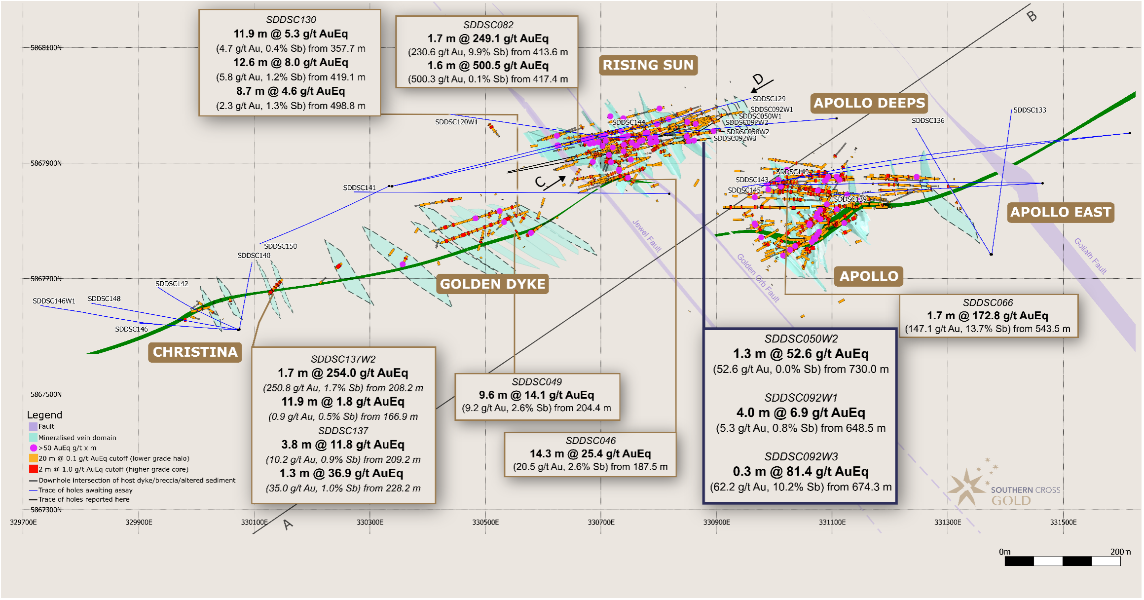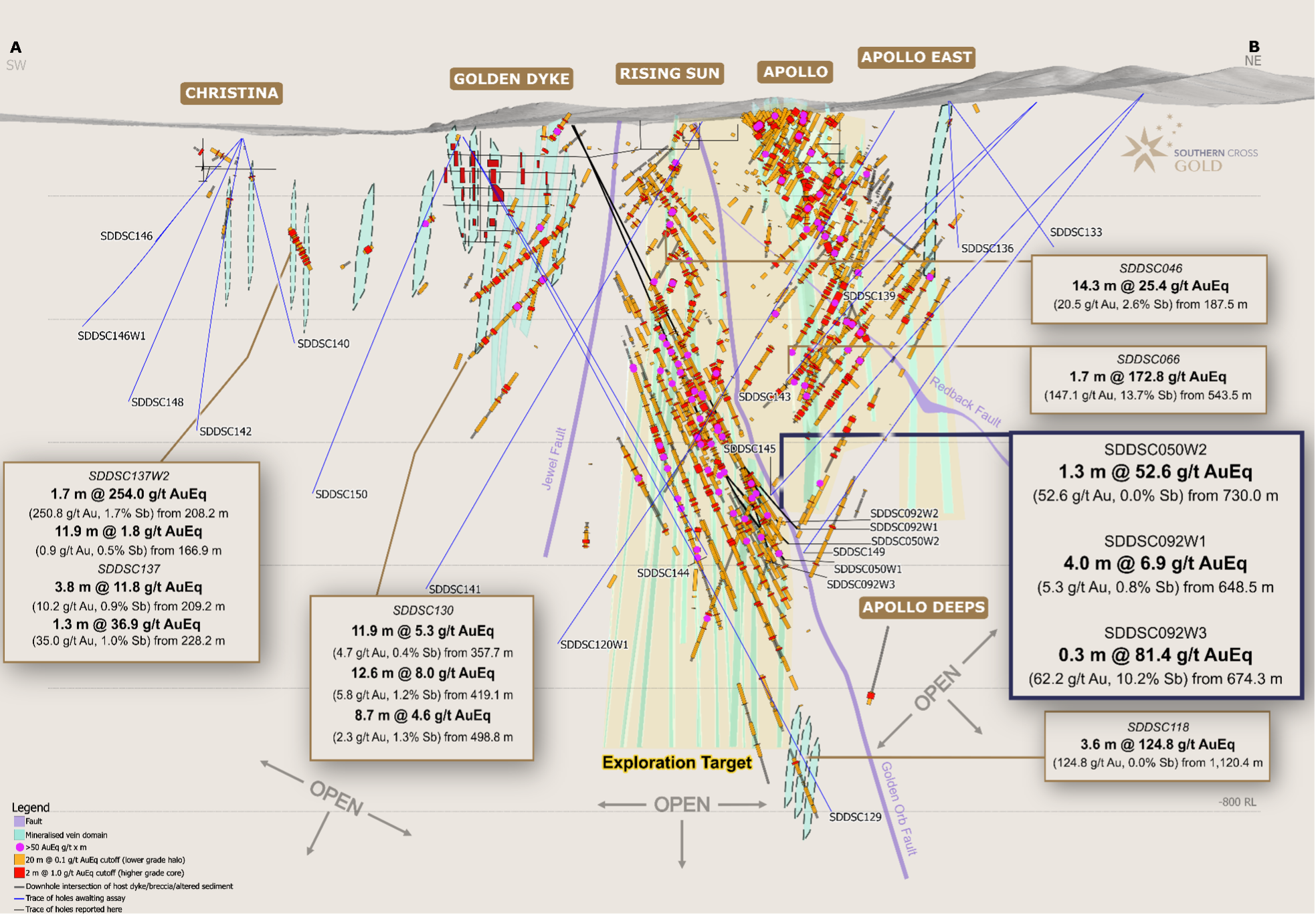 Holes SDDSC092W1, SDDSC092W2 and SDDSC092W3 were drilled to test up dip extension of mineralisation on the margins of the Golden Orb Fault. SDDSC092W1, SDDSC092W2 drilled through the Golden Orb Fault earlier than predicted and therefore failed to test the Rising Sun mineralisation. However, the holes intercepted high grade gold and antimony mineralisation in a previously undrilled zone before the Rising Sun target area. Drill hole SDDSC092W3, drilled below the Golden Orb Fault, also intercepted the untested mineralisation as well as confirming geological continuity at 15 m to 30 m separation from mineralisation defined in the parent hole.