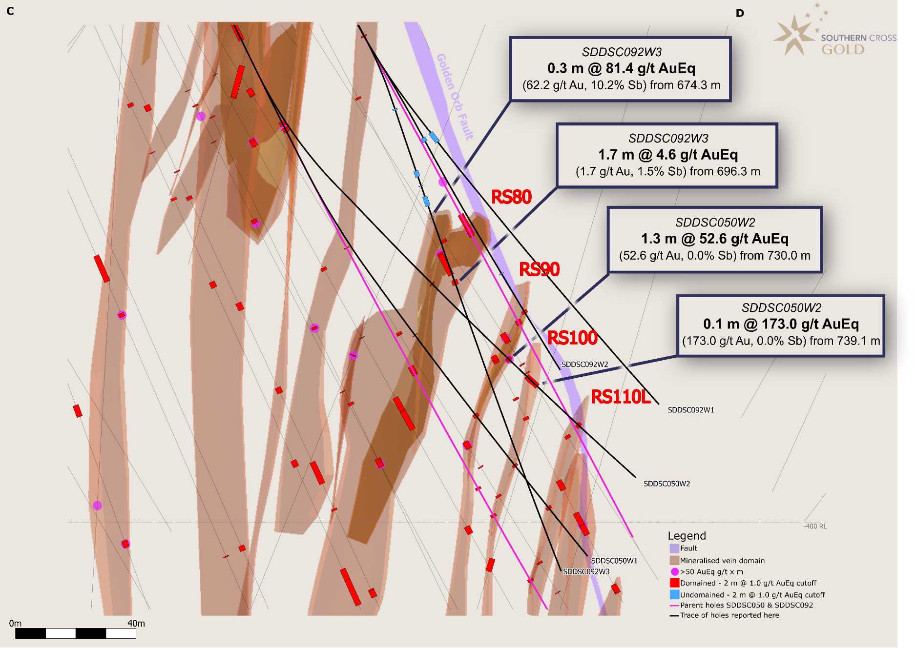 SDDSC050W1 was collared 626 m down SDDSC050 and core return commenced at 675.3 m. This drillhole intersected each vein set at lower grades from 12 m, 18 m, 20 m and 28 m of separation from the parent hole on the RS80, RS90, RS100 and RS110L vein sets, respectively, confirming geological continuity. Highlights included 1.2 m @ 1.8 g/t AuEq (1.7 g/t Au, 0.1% Sb) from 736.8 m from vein set RS80.