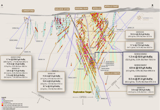 Figure 2: Sunday Creek longitudinal section across A-B in the plane of the dyke breccia/altered sediment host looking towards the north (striking 236 degrees) showing mineralised veins sets. Showing holes SDDSC050W1, SDDSC050W2, SDDSC092W1, SDDSC092W2 and SDDSC92W3 reported here (blue highlighted box, black trace), with selected intersections and prior reported drill holes. The vertical extents of the vein sets are limited by proximity to drill hole pierce points. For location refer to Figure 1.
