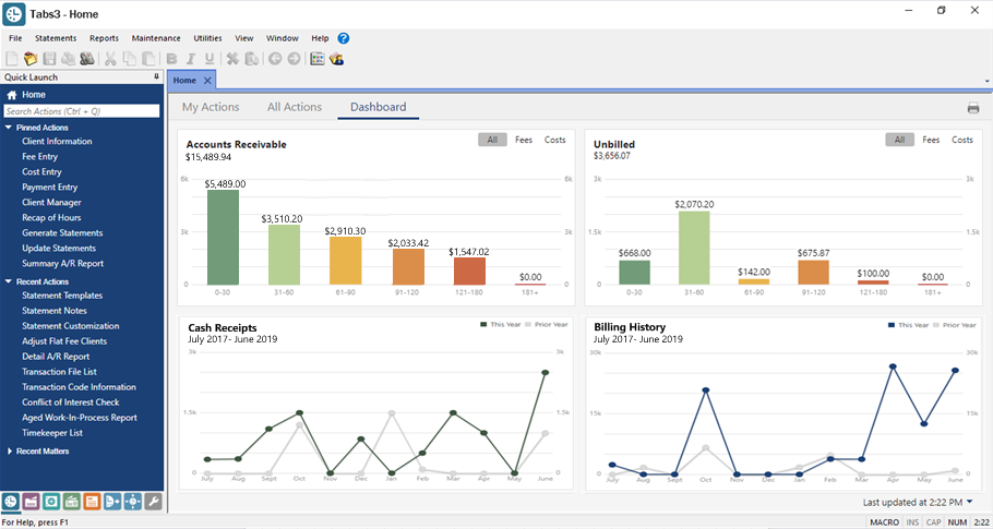 Version 2020 continues to update the look and feel of all Tabs3 Software products. With over 40 years of experience in the legal industry, Tabs3 Software understands what tools firms need to build successful practices. The new dashboards make essential information like accounts receivable, billing history, trust transactions, and unpaid invoices readily available and easy to understand.