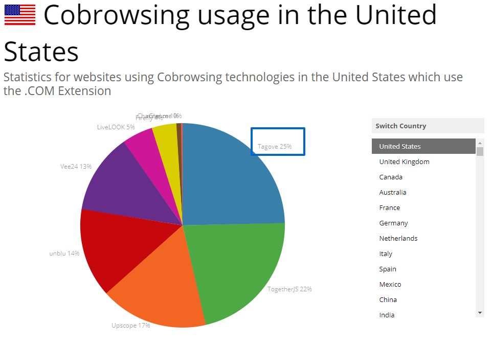 SAN FRANCISCO, December 6, 2017 (Newswire.com) - Tagove has been chosen as one of the top 25 fastest growing SaaS B2B companies globally by Cardin Partners. Not enough, wait, as per BuiltWith data, they have overtaken some leading/established companies in just one year and dominated the majority co-browsing market share across the USA in 2017.