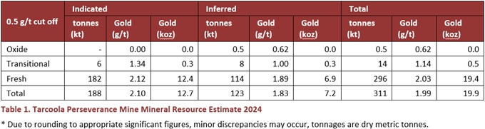 Further to the updated Perseverance Mine JORC MRE detailed in this announcement, Tarcoola's overall Mineral Resource endowment has grown by ~87% to a total 29.5koz Au (0.54Mt @ 1.70 g/t Au).