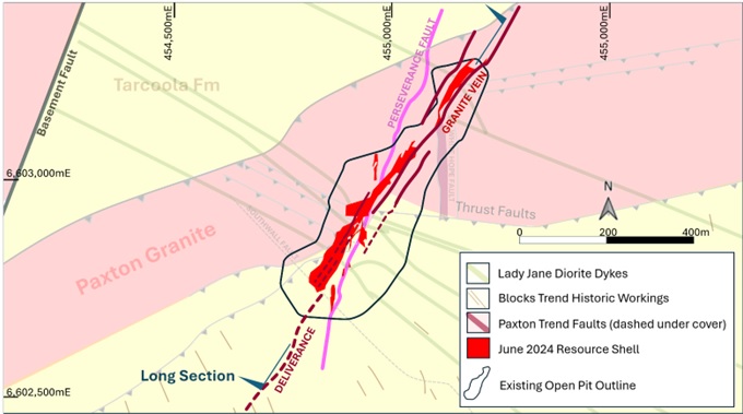 At the Perseverance Deposit, gold mineralisation is controlled by a sub-vertical NE-NNE trending fault zone within the sedimentary rocks of the Tarcoola Formation and the Paxton Granite, both of Proterozoic age. A suite of later intrusions (Lady Jane Diorite) cut both the sedimentary rocks and the granite. These high level mafic intrusives are associated with the 1590 Ma Hiltaba Magmatic Event, and are considered to control the spatial setting of both gold and base metal mineralisation.