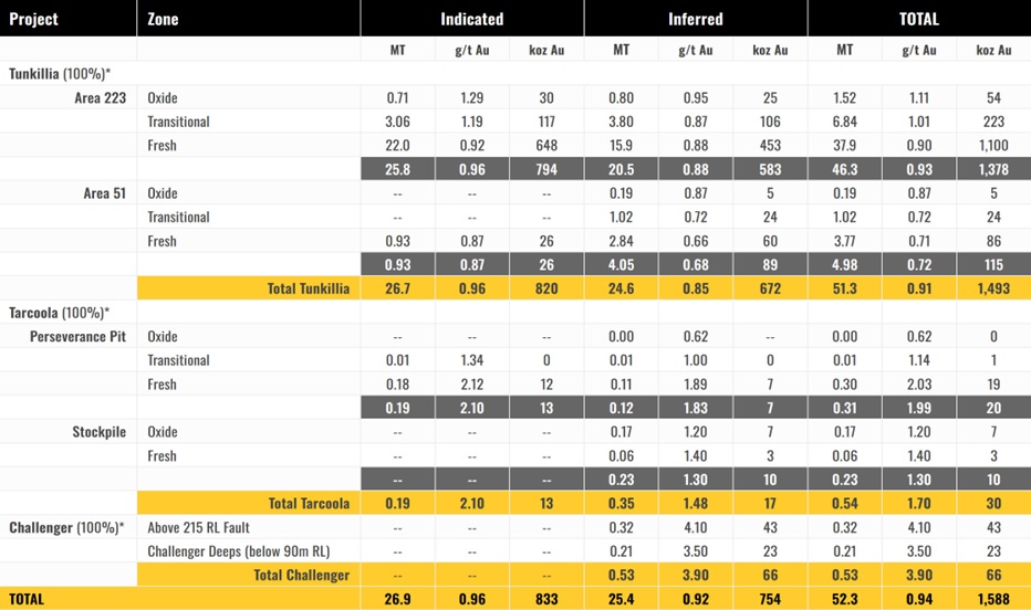 The updated Tarcoola JORC MRE (as at June 2024) is shown below at Table 1.