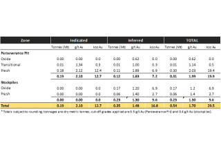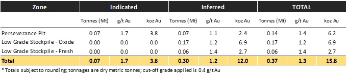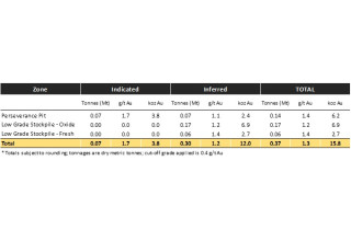 Approximately 1,688m of recent Barton drilling has delivered an updated JORC (2012) Mineral Resources Estimate (MRE) of 19.9koz Au within 60 - 80m of the Perseverance Mine open pit floor. The total Tarcoola MRE is now 29.5koz Au (0.54Mt @ 1.70 g/t Au) , with ~45% classified as ‘Indicated' category, including 9.6koz Au contained in lower-grade existing stockpiles next to the Perseverance Mine.