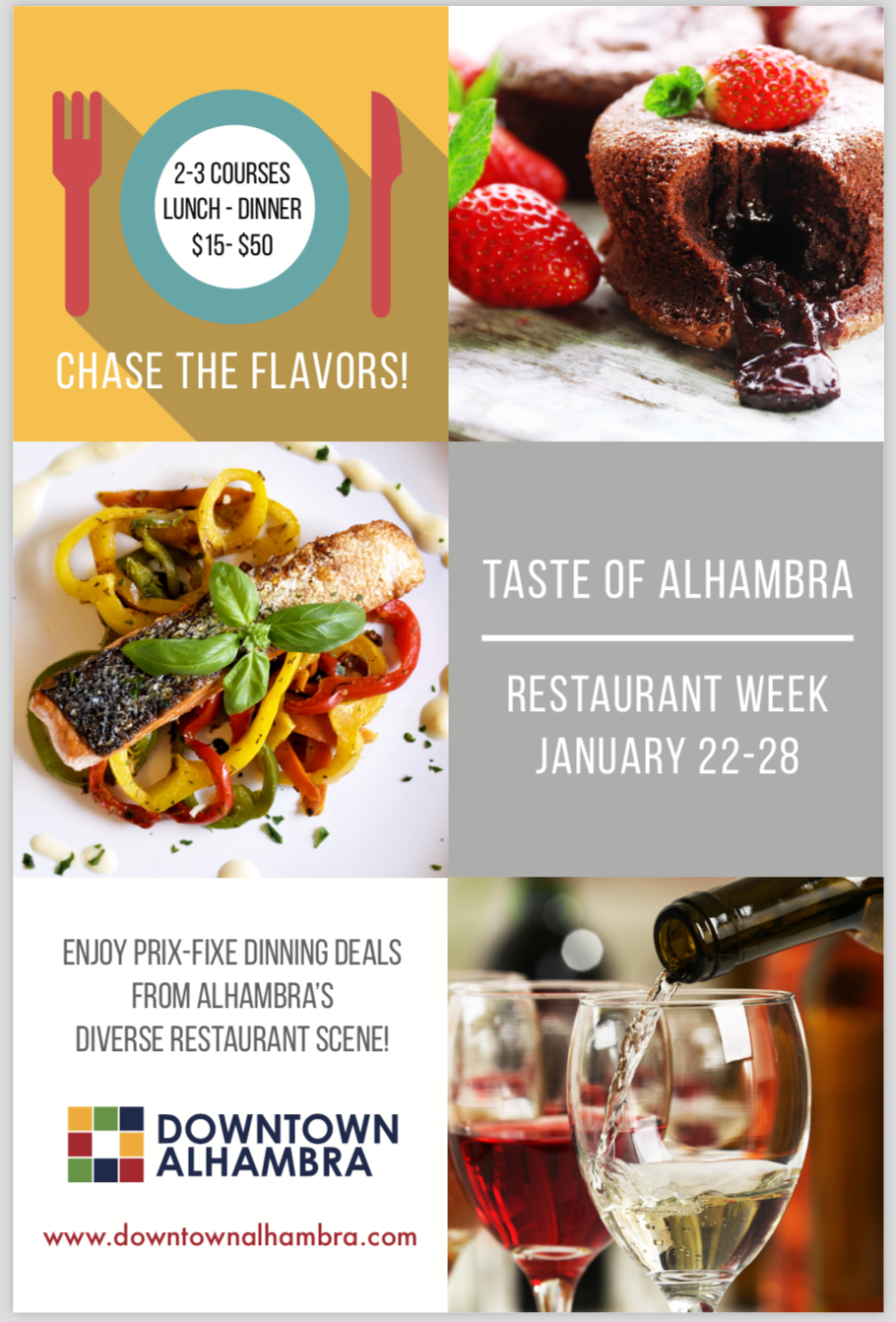 “Taste of Alhambra Restaurant Week” from Jan. 22-28, as part of “Visit California Restaurant Month,” a national event celebrated in many major cities to help stimulate tourism and patronage at local restaurants.