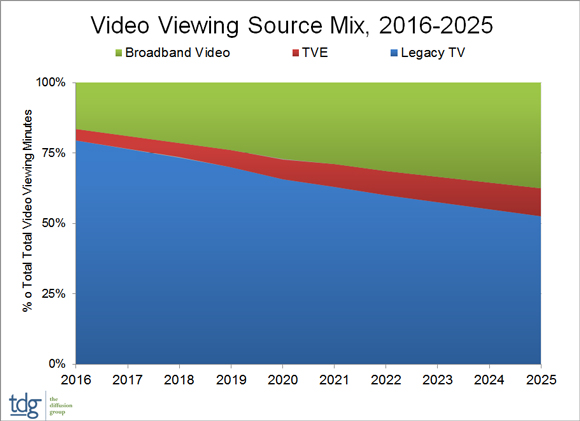 Plano, TX, April 5, 2016 (Newswire.com) - A new groundbreaking study from The Diffusion Group (TDG) details the coming shift from Legacy TV to Broadband Video sources over the next decade. Broadband Video will grow from 17% of total viewing minutes in 2015 to 38% by 2025, up 81%, while Legacy TV will decline from 80% of total viewing minutes to 53%, down 34%. These and other insights are featured in TDG's latest report, The Future of TV Viewing, 2016-2025.