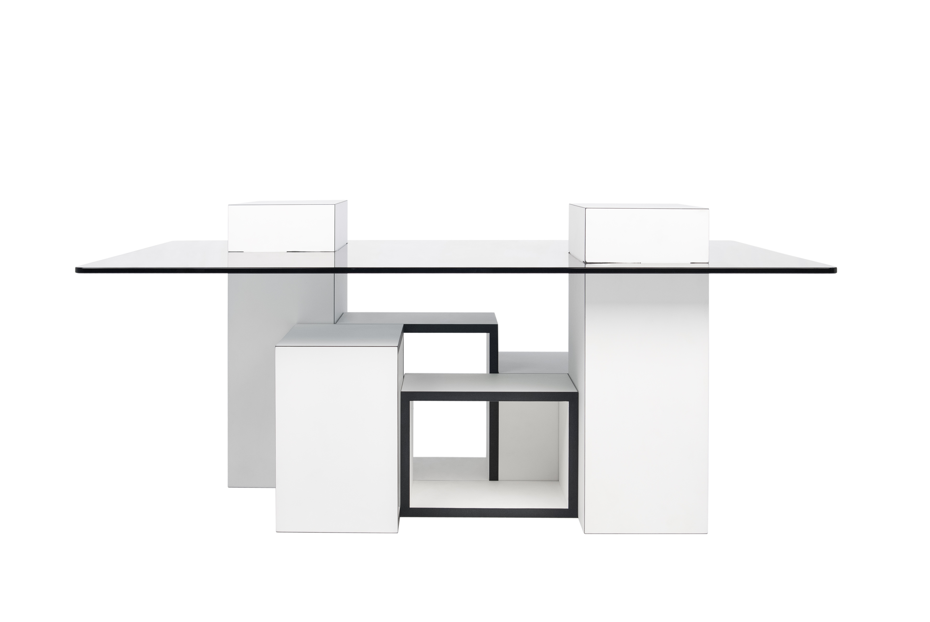 Designed by Inês Martinho, the Gutta coffee table reveals the shapes of a modern metropolitan city. This architectural piece, composed of six boxes attached together to support a glass top, brings together thin and light elements enhanced by two contrasting clean and neutral colors.