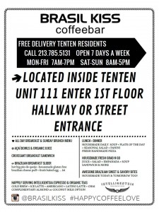 The coffee bar is easily accessible from within TENTEN or from the street. Even better, tenants can have their coffee and or any delicious Brasil Kiss bites delivered to their residence—for free. Simply call 213-785-5131 to place an order.