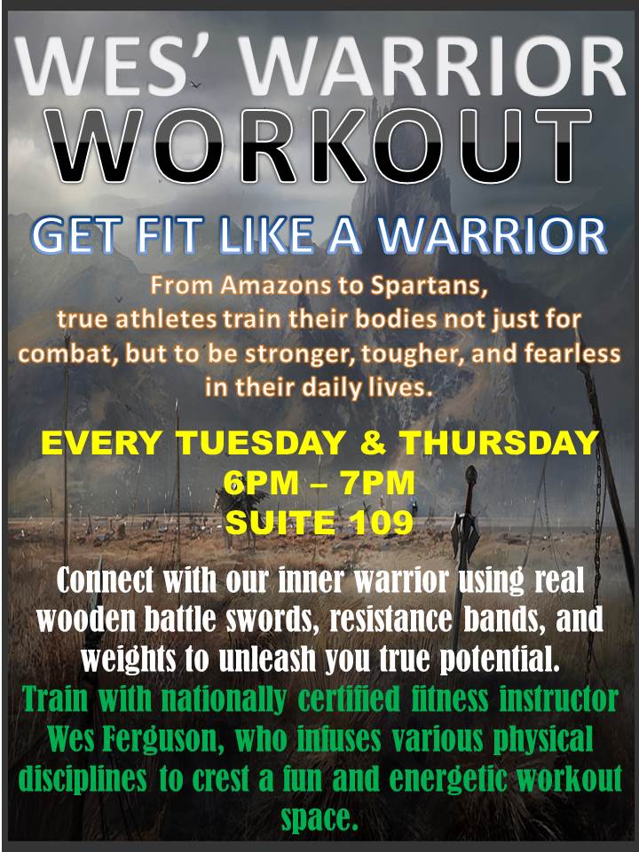 Los Angeles, California, February 13, 2018 (Newswire.com) - For those looking to get fit, Wes Ferguson is offering his Warrior Workout every Tuesday and Thursday from 6:00 – 7:00 pm at TENTEN Wilshire, Suite 109. Wes believes that it is essential for true athletes—like warriors—to train not just for competition or combat but to be stronger, tougher, and more fearless in every aspect of daily life. So, tenants are invited to connect with their inner warrior using resistance bands, weights, and real wooden battle swords in order to unleash their true potential.