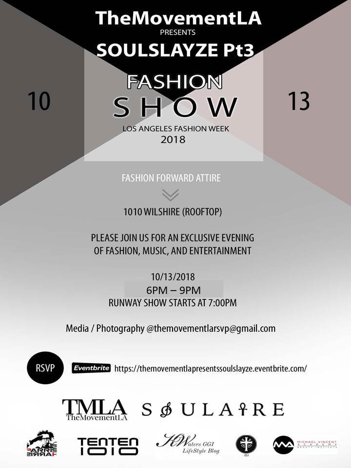 LOS ANGELES, October 11, 2018 (Newswire.com) - TENTEN Wilshire will host Soulslayze Pt3 presented by TheMovementLA on Saturday, October 13, from 6-9 p.m. as part of LA Fashion Week 2018. The runway show starts at 7 p.m. and will feature fashion-forward attire for trendsetters and the fashion conscious. Guests will participate in a memorable evening of thought-provoking fashion, music, and entertainment while enjoying the breath-taking skyline views from the award-winning 1010 Wilshire rooftop. This 15,000 square foot outdoor space features a gorgeous pool, fire pit area, a lounge for guests to relax and mingle with plenty of seating. This red carpet event will feature an open bar in an elegant setting. Partners for this exclusive event include Parris Harris, Michael Vincent Academy, and Soulaire. For more information, contact media/photography@[email protected].