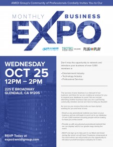 LOS ANGELES, October 3, 2017 (Newswire.com) - Next up, in the monthly business expo series, the AMIDI Group community of professionals cordially invites you to attend the next exciting event on Wednesday, October 25. From noon – 2:00 p.m. at the Hollywood Production Center location in Glendale at 225 E. Broadway in Glendale, don’t miss an incredible opportunity to network and introduce your business to more than 1,000 members. Meet people in the entertainment industry, the tech industry, and professional services such as legal, accounting, and banking. Co-hosted by the AMIDI Group, Hollywood Production Center, TENTEN Wilshire and Plug and Play, this is not your typical business expo. At Monthly Business Expo, you are a partnering community member.The entire event is designed to help your business flourish. As soon as you receive this invite: