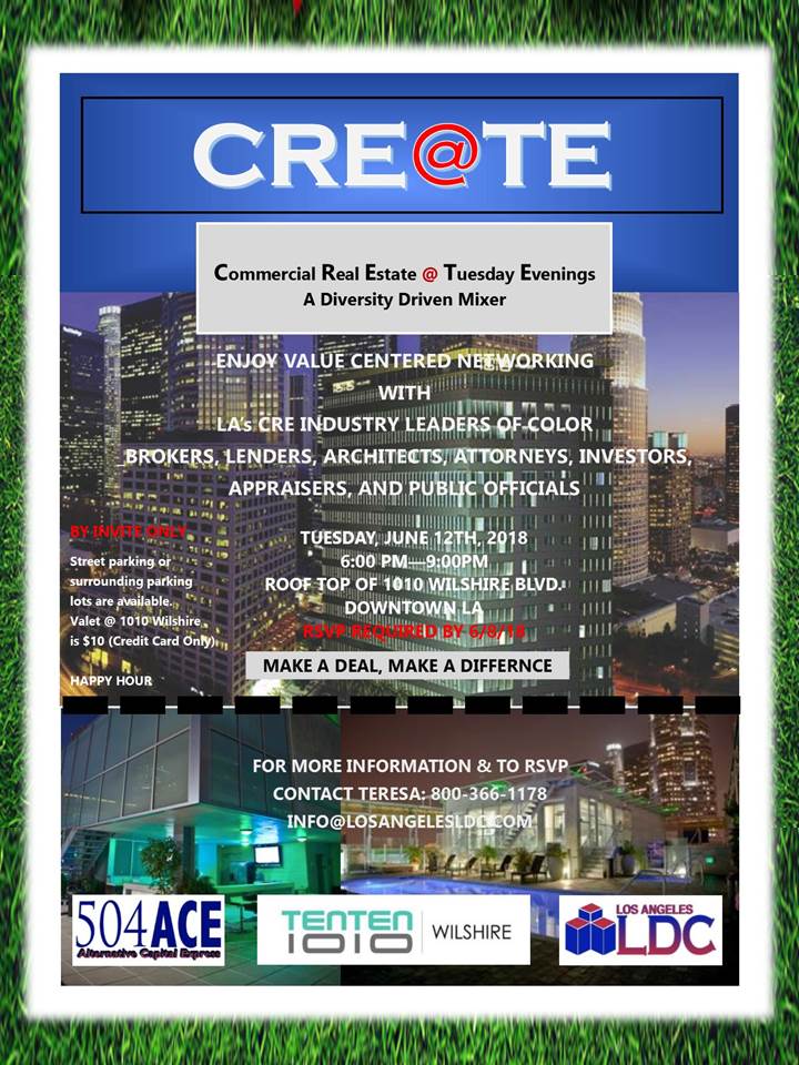 Los Angeles, California, June 12, 2018 (Newswire.com) - The CRE@TE mixer is back at the TENTEN Wilshire rooftop on Tuesday, June 12, from 6:00 to 9:00 pm. CRE@TE (Commercial Real Estate @ Tuesday Evenings) is a diversity-driven mixer celebrating the Los Angeles CRE industry leaders of color—brokers, lenders, architects, attorneys, investors, appraisers, and public officials. CRE@TE value-centered networking event offers industry professionals the opportunity to make deals and make a difference as the mix, mingle, and take in the views from one of downtown LA’s most beautiful settings—the award-winning TENTEN Wilshire rooftop. The event is free and happy hour food and drinks will be served.