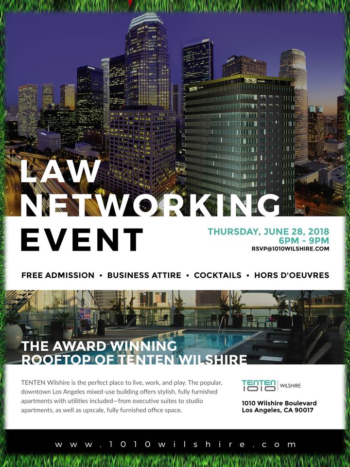 LOS ANGELES, June 26, 2018 (Newswire.com) - On Thursday, June 28, from 6:00 to 9:00 P.M., join fellow members of the Los Angeles legal community for a summer Law Networking event. The perfect spot to take in the glorious LA summer night and mix and mingle with old friends and new, the award-winning TENTEN Wilshire rooftop offers it all—poolside relaxation, rooftop bar, and some of the most dramatic views in the city. Guests will enjoy specialty cocktails and fine hors d’oeuvres.