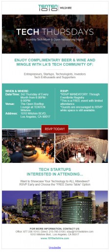 RSVP at Eventbright for Tech Thursdays at TENTEN Wilshire. For more information, call 877-388.1010 or email [email protected]. If you’d like to showcase your technology to all attendees, RSVP early and sign up for a free demo table.