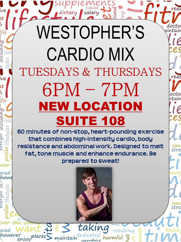 Please note: Westopher’s Cardio Mix is moving to Suite 108. Tenants are reminded to bring water and a yoga mat or towel. And be prepared to sweat!