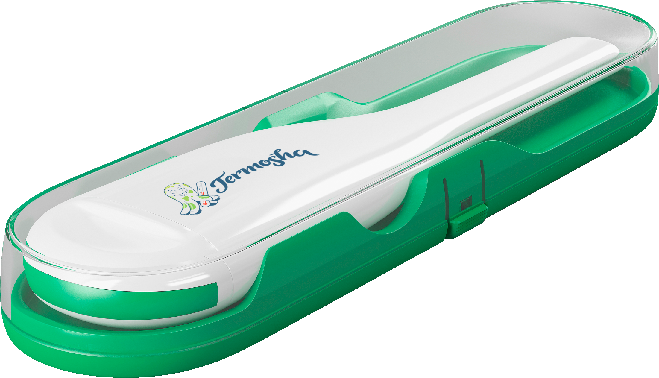 But its main destination is to take the body temperature of babies. Termosha Baby Smart Thermometer is absolutely safe for the most precious little patients. It has a wide flat probe without a metal tip; it is more convenient for taking the temperature in the armpit and more pleasant to do that under the tongue. It is made of a hypoallergenic medical plastic. Termosha takes a body temperature with the highest precision of ±0,1°C; the thermometer provides the first result in 40…120 seconds with the function of prediction. The thermometer turns on automatically as soon as the probe is heated and transmits the data via Bluetooth to a smart phone or a tablet. Little children can measure the temperature by themselves without the help of adults through children's mobile app. An amusing little octopus also named Termosha will entertain kids in the process of measuring: he will show his home, introduce his mom and dad, and play games. Kids won’t even notice as the time flies by. If the temperature turns out to be high, Termosha will tell a child what to do: get into bed, take medicine given by her/his parents, or sponge down.
