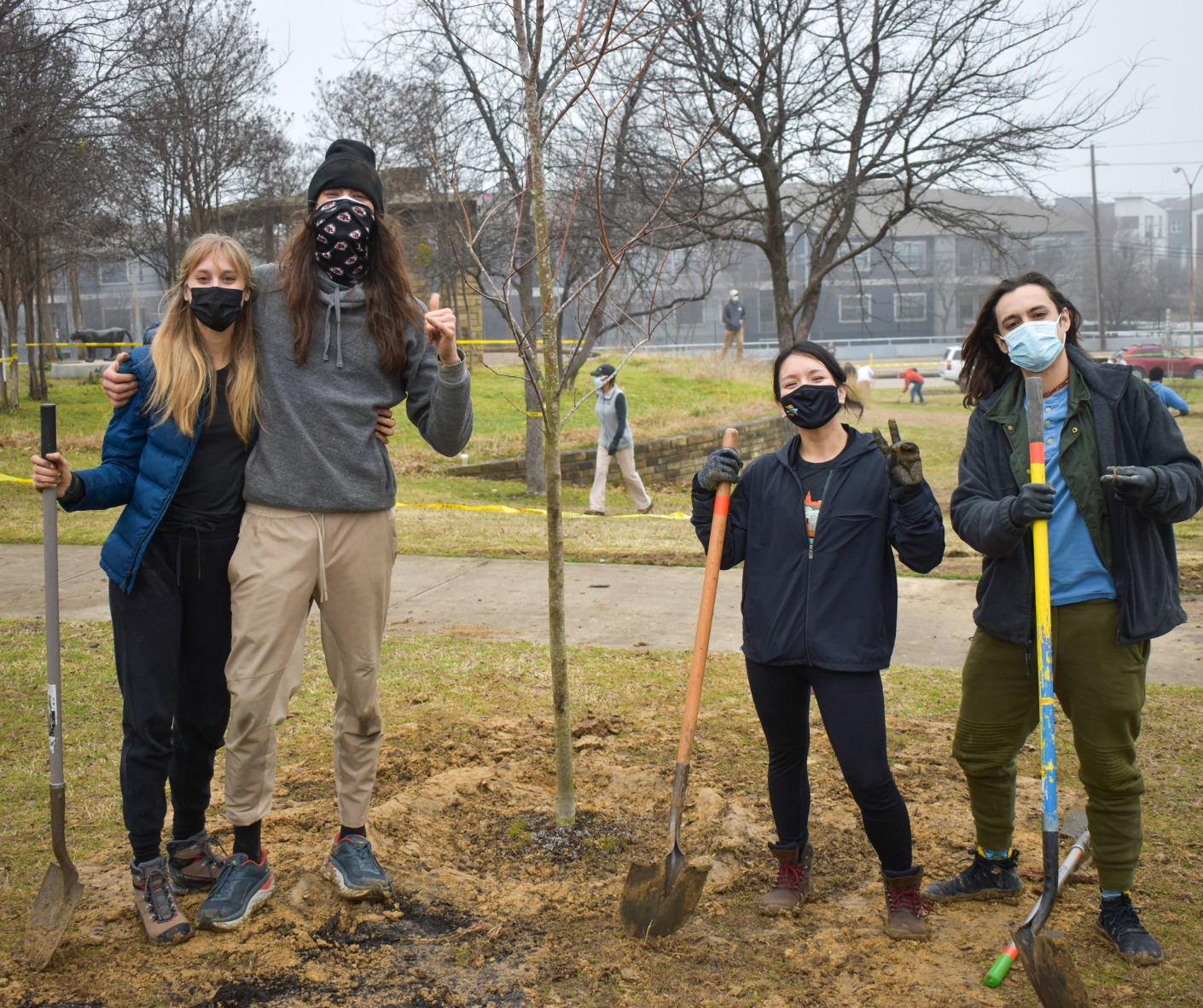 Volunteers recruited by the City of Dallas planted 13 different types of trees at both parks including American Elm, Bur Oak, Carolina cherry laurel, Lacebark Elm, Chinese Pistache, Chinquapin Oak, Roughleaf Dogwood, Eve's Necklace, Mexican Sycamore, Mexican White Oak, Pecan, Possumhaw Holly, and Vitex.