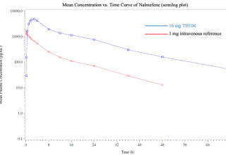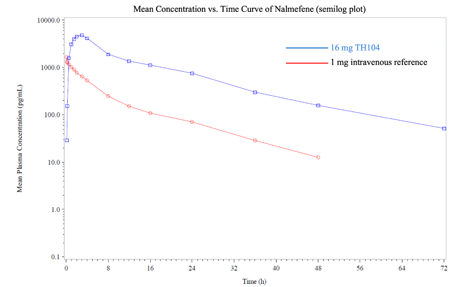 Findings from the study indicate that the primary endpoint of the absolute bioavailability (F) of TH104, or fraction (or percentage) of the administered dose absorbed into the systemic circulation compared to an equivalent intravenous dose of nalmefene, was 0.459 (45.9%). The median time to maximum concentration (Cmax) of TH104 was 2.0 hours, with rising concentrations beginning within minutes of dosing. The mean half-life (T1/2) as measured in the blood of subjects was 14 hours after a single buccal administration of TH104, compared to 9 hours for the 1mg intravenous dose of nalmefene.