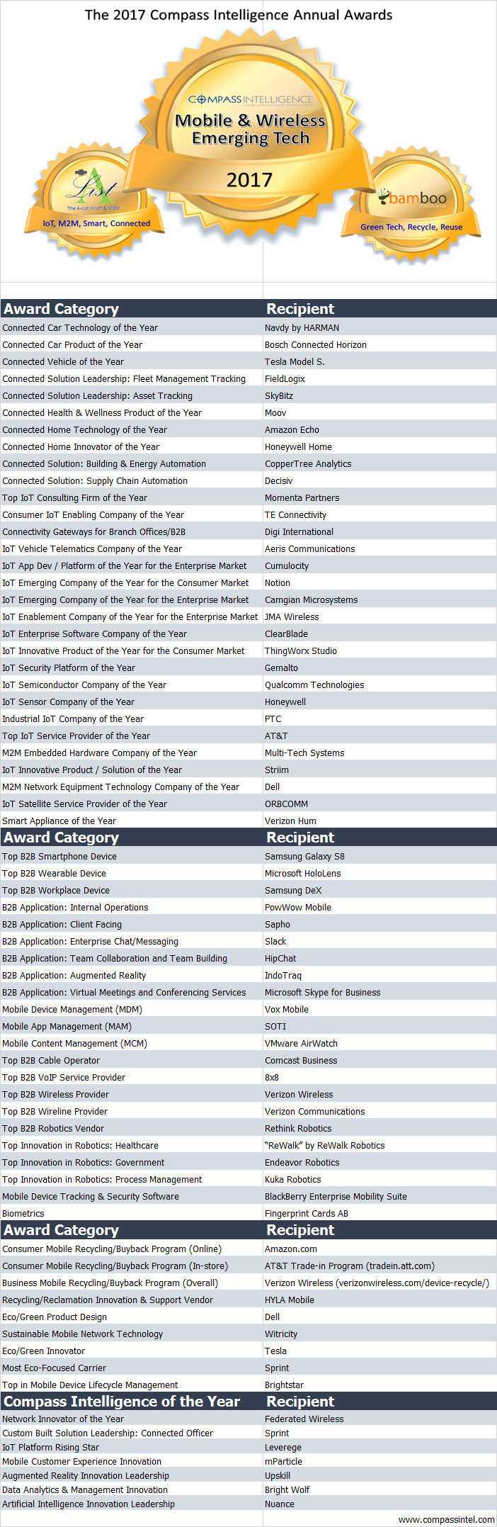 The award recipients of the 5th Annual Compass Intelligence Awards are as follows: