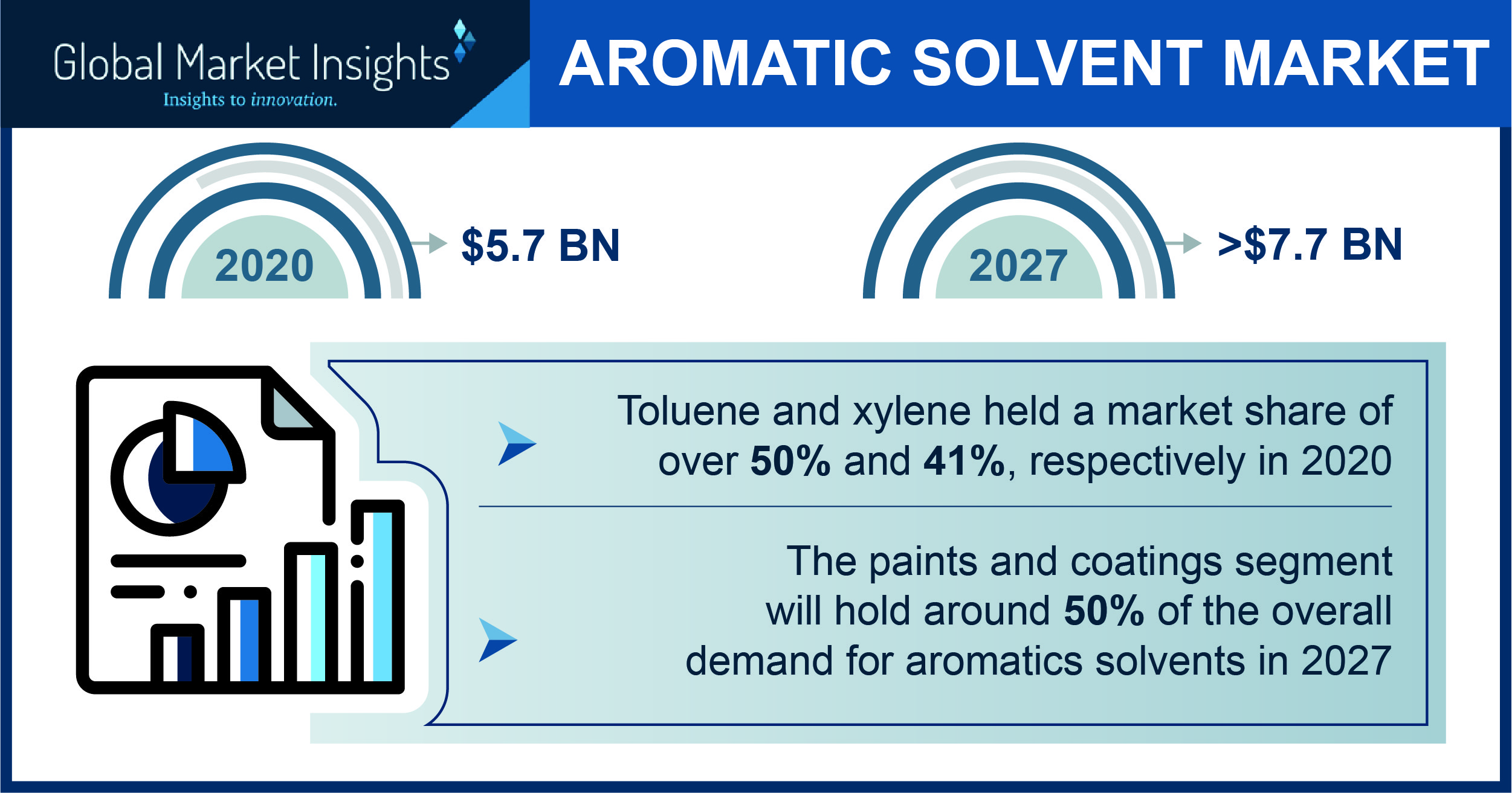 SELBYVILLE, Del., July 13, 2021 (Newswire.com) - Based on the Global Market Insights Inc. report, the global Aromatic Solvents Market was estimated at $5.7 billion in 2020 and is slated to exceed $7.7 billion by 2027, registering a CAGR of 4.4% from 2021 to 2027. The report provides a thorough analysis of the main investment avenues, major winning strategies, drivers and opportunities, wavering industry trends, market estimations as well as size, competitive scenarios.