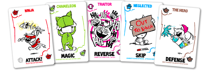 At the beginning of the game, each player is dealt nine cards which signify the nine lives of a kitten and the goal is to be the last kitten left alive. Players are able to attack the lives of one another by using ‘Killer Kitten’ cards and defend themselves with ‘Hero Kitten’ cards. The card deck also includes a variety of action cards that enhance the game’s strategy. As players become eliminated, the game grows more intense and the impact of Killer Kitten becomes amplified.