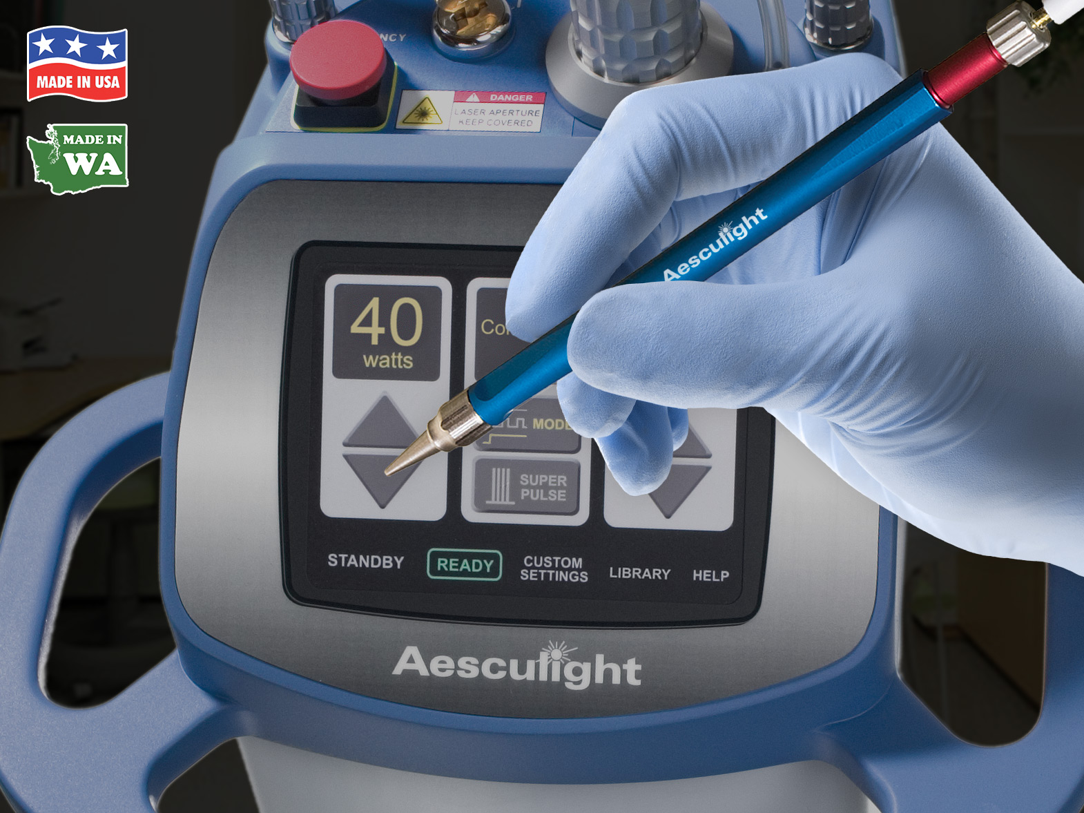 The Aesculight system is the only veterinary surgical laser that is made in the United States. Aesculight is a subsidiary of LightScalpel, LLC, and is solely located in Woodinville, WA, USA. There at the Woodinville headquarters, they design, manufacture, and maintain the highest quality and most advanced surgical CO2 lasers. Their lasers and accessories have been made in the USA for over 25 years (Luxar, NovaPulse and Accuvet in the past; now Aesculight and LightScalpel). There have been several improvements upon Aesculight’s surgical laser technologies over the years, including: tipless laser handpieces, customizable controls, improved laser pulsing modalities, and overall improved durability, quality, and ergonomics.