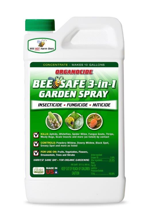 Organocide® Bee Safe 3-in-1 Garden Spray is an insecticide, miticide and fungicide that has been used in organic gardening for more than 27 years. It has been proven effective in destroying all life stages of small soft-bodied insects (including aphids, fungus gnats, leaf rollers, psyllids, spider mites, scale and whiteflies) and controlling fungal diseases (like powdery and downy mildews). It is safe enough to use near aquatics and it won’t harm beneficial insects like ladybugs, butterflies, or our precious pollinating bees. It is people, pet and planet safe! It is available for purchase at select Home Depot, Walmart and Independent Hardware and Nursery retailers.