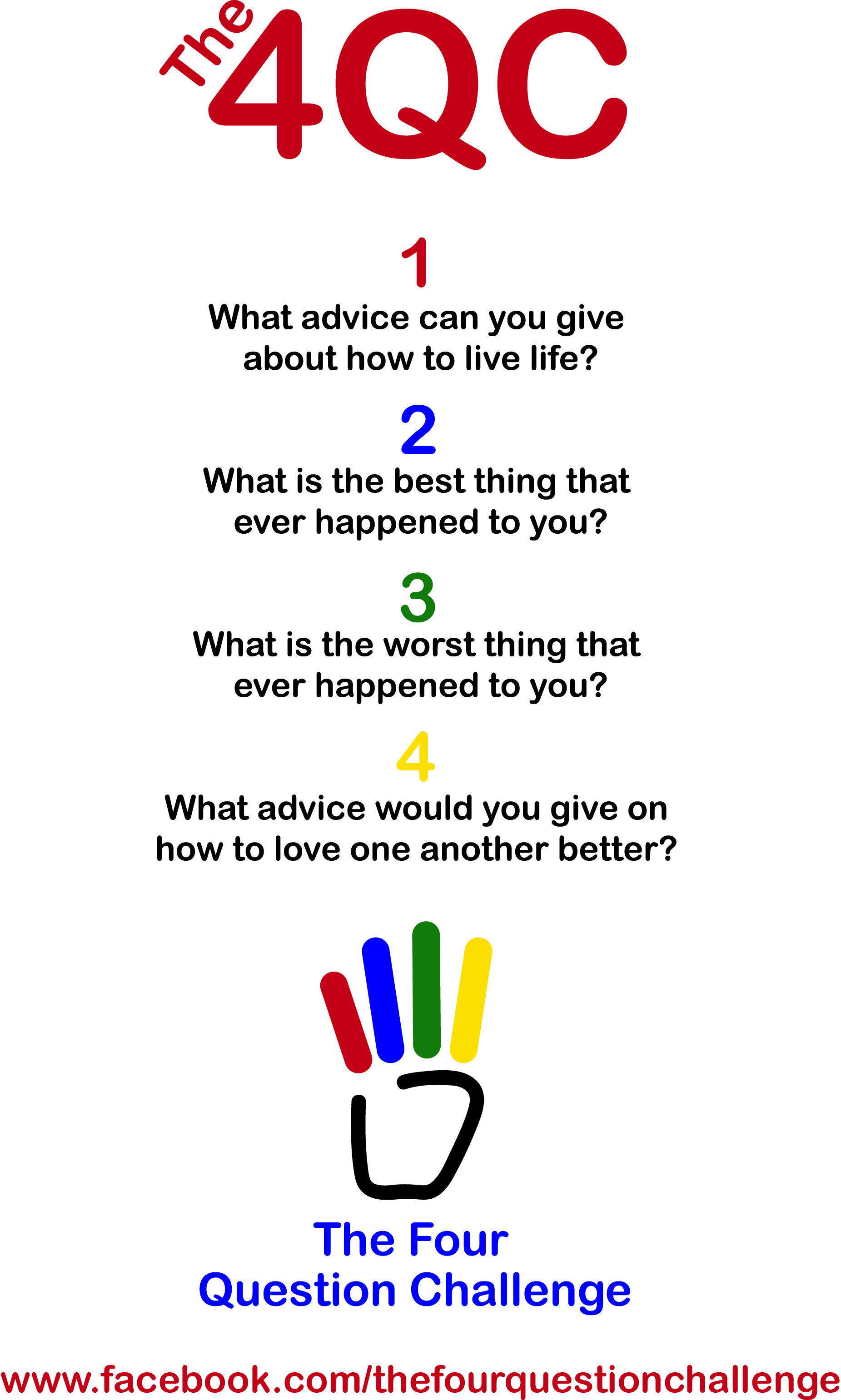 Visit www.facebook.com/thefourquestionchallenge or follow us on Twitter and Instagram.