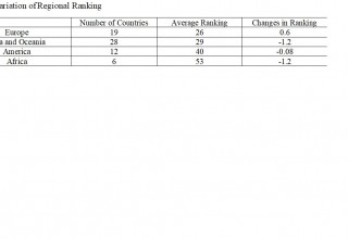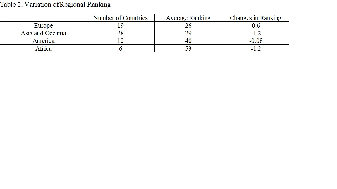 According to the national average ranking by region and the average change in ranking compared to the previous year, the average ranking in Europe, where developed countries are mostly concentrated, is the highest by region at 26th, up 0.6 step from last year, making it the only region with a rise in the ranking among the four regions. On the other hand, Asia and Oceania ranked 29th on average, down 1.2 step from last year, America 40th on average, down 0.08 step from last year, and Africa 53rd on average, down 1.2 step from last year (see Table 2).