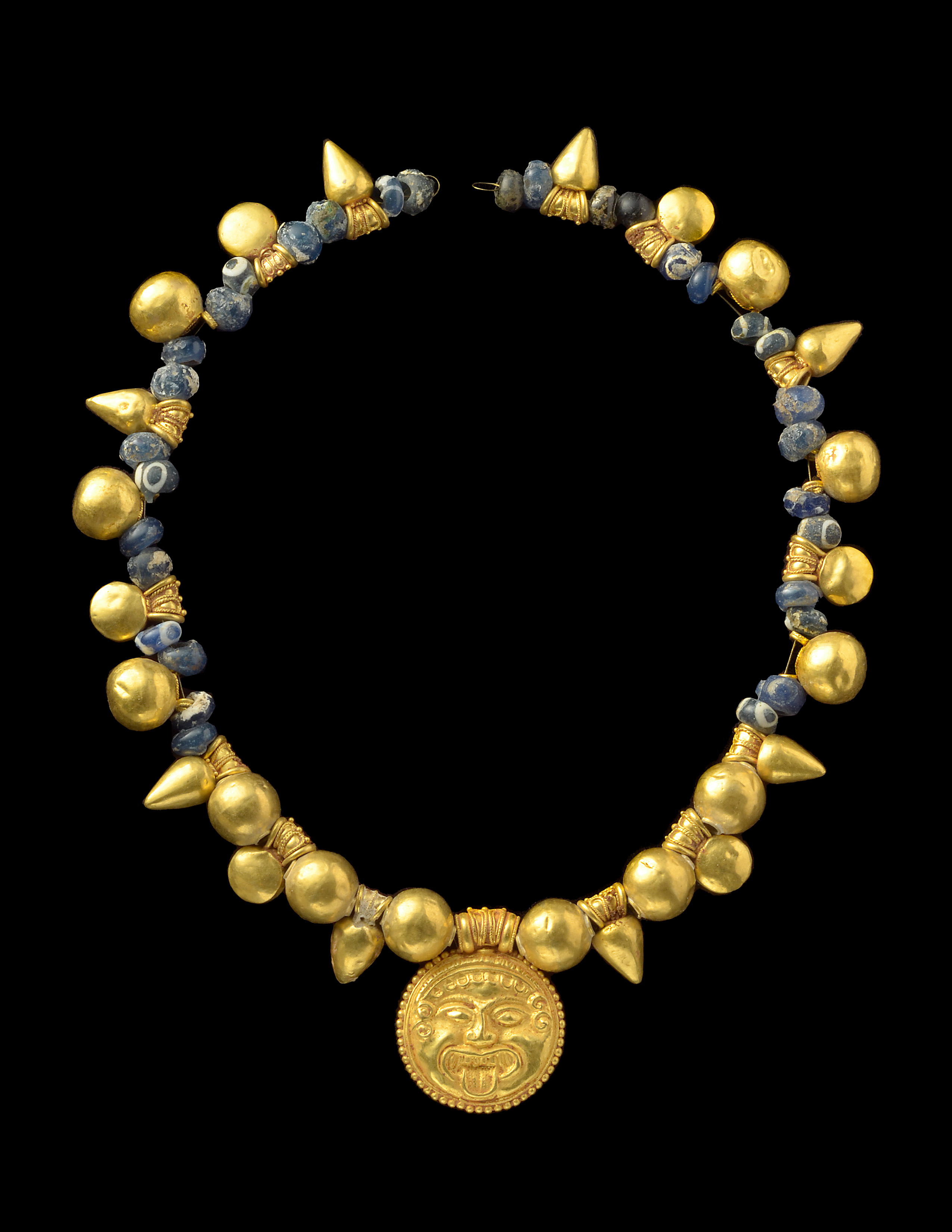 Among the highlights is a stunning 5th-century B.C. Greek gold and glass necklace with a protective medallion of Medusa. In Greek mythology, Medusa is best known for having hair made of snakes and for her ability to turn anyone she looked at into stone, but the most common interpretation suggests she is an apotropaic symbol used to protect from the negative. This extraordinary piece exemplifies the elaborate craftsmanship and rich symbolism of ancient jewelry.