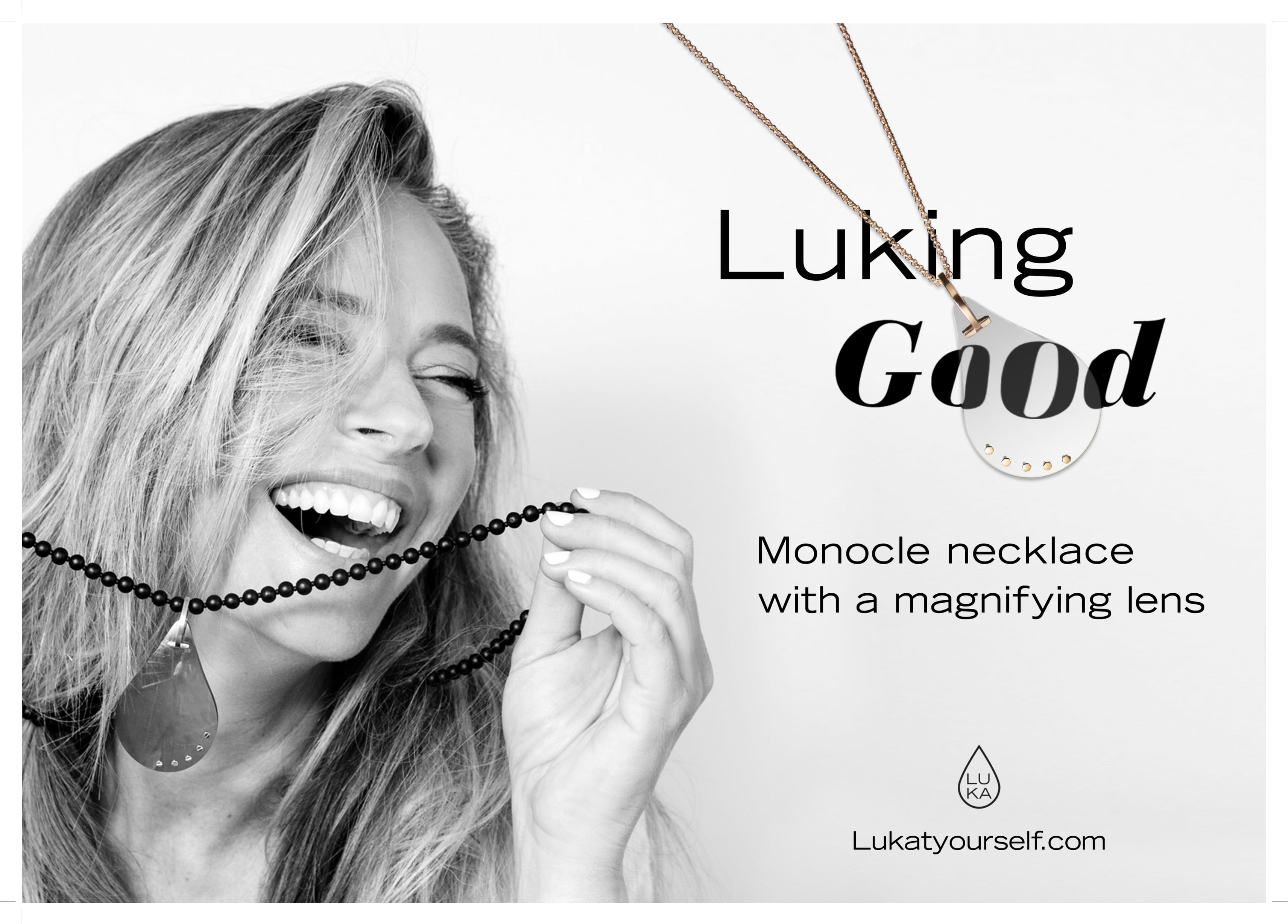 Luka is a fashion accessory, monocle necklace, magnifying optical lens. For more information, visit Lukatyourself.com.