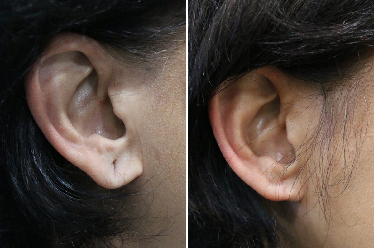 Patients who wish to wear earrings again are generally advised to wait 8 to 12 weeks before re-piercing. To minimize re-tearing risks and achieve better results, new piercings should be positioned slightly away from the surgical scar area.