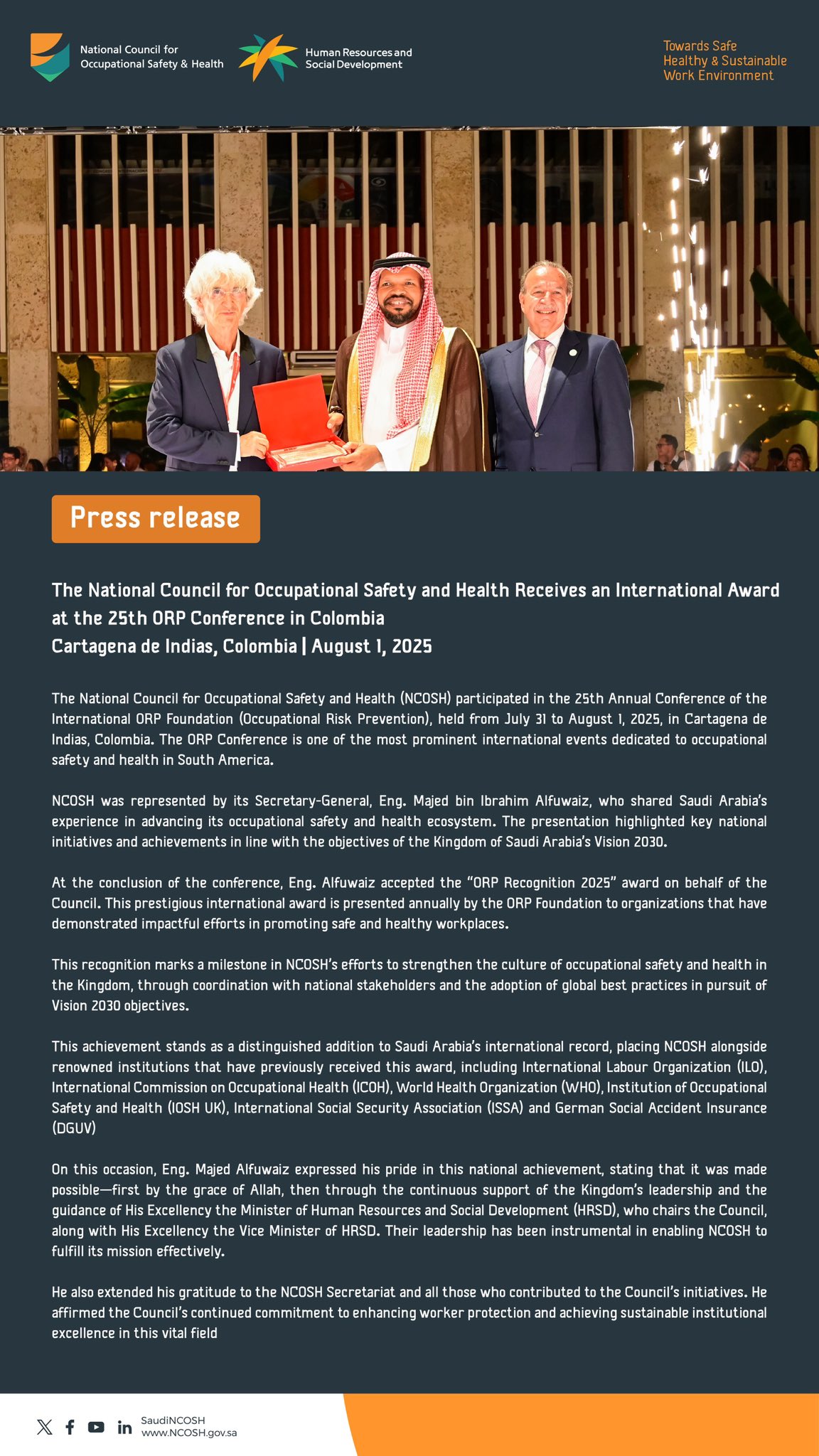 This achievement stands as a distinguished addition to Saudi Arabia's international record, placing NCOSH alongside renowned institutions that have previously received this award, including International Labour Organization (ILO), International Commission on Occupational Health (ICOH), World Health Organization (WHO), Institution of Occupational Safety and Health (IOSH UK), International Social Security Association (ISSA) and German Social Accident Insurance (DGUV)