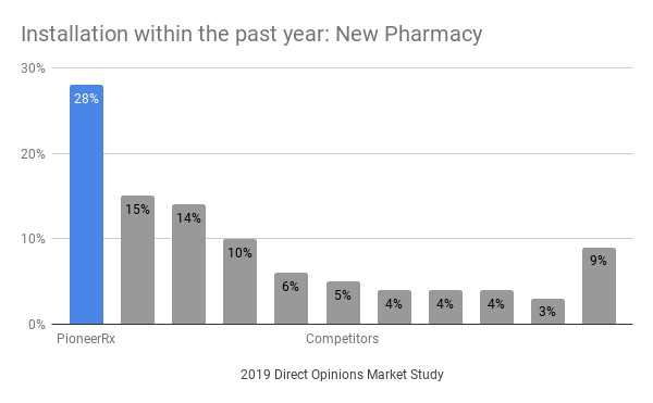 Independent pharmacists who started their own pharmacy within the past year chose PioneerRx almost 2 to 1, in comparison with the next closest competitor. PioneerRx led the way with 28% of all new store installations, with the runner-up at 15%. (Refer to Image 2 below.)