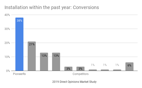 Almost double the number of independent pharmacists who changed systems within the past year chose PioneerRx, compared to the next closest competitor. PioneerRx topped the chart with 38% of all conversions, followed by a runner-up of 21%. (Refer to Image 1 below.)
