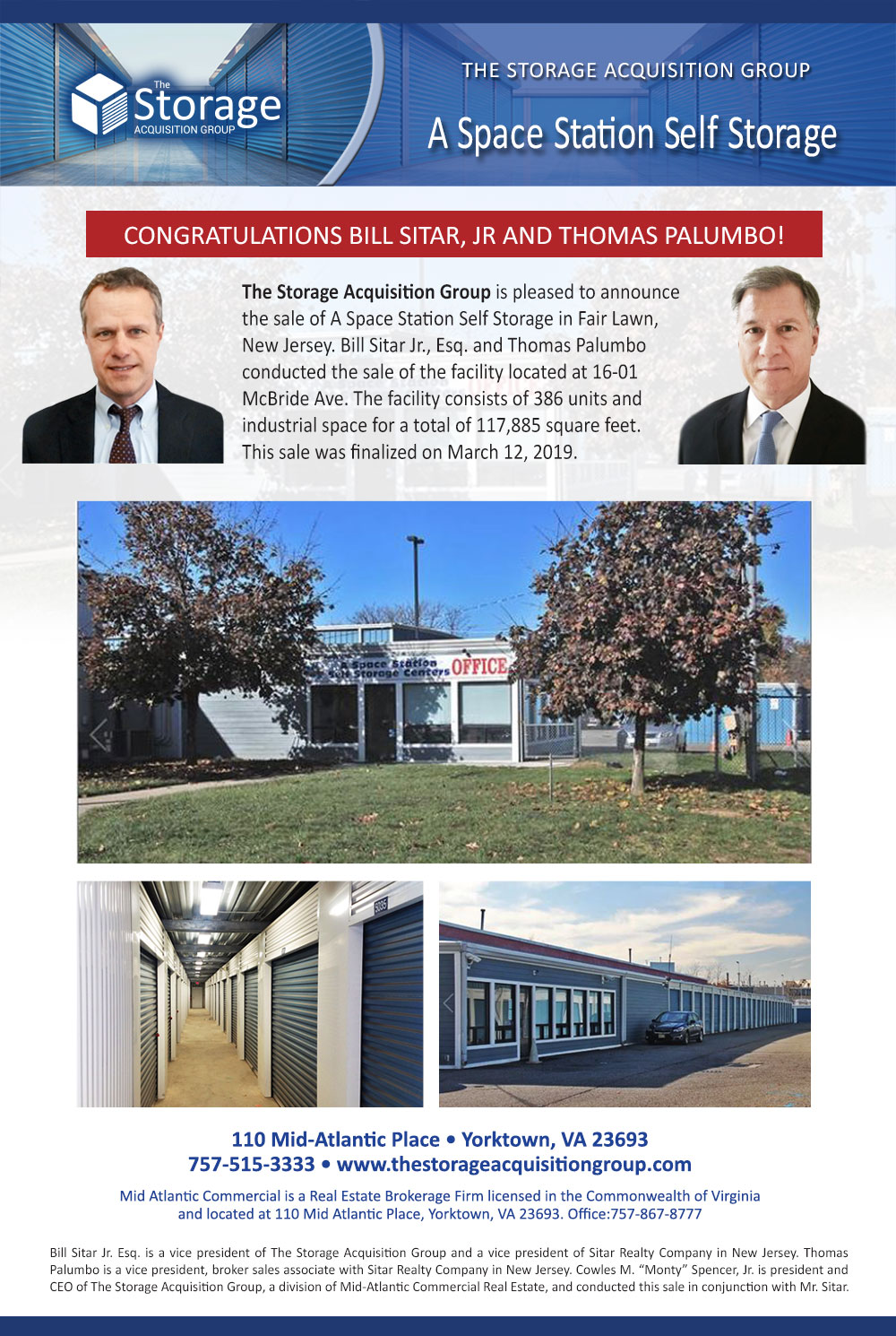FAIR LAWN, N.J., March 20, 2019 (Newswire.com) - The Storage Acquisition Group today announced the sale of A Space Station Self Storage in New Jersey. The facility is located at 16-01 McBride Avenue in Fair Lawn. The sale was finalized on March 12, 2019.
