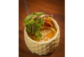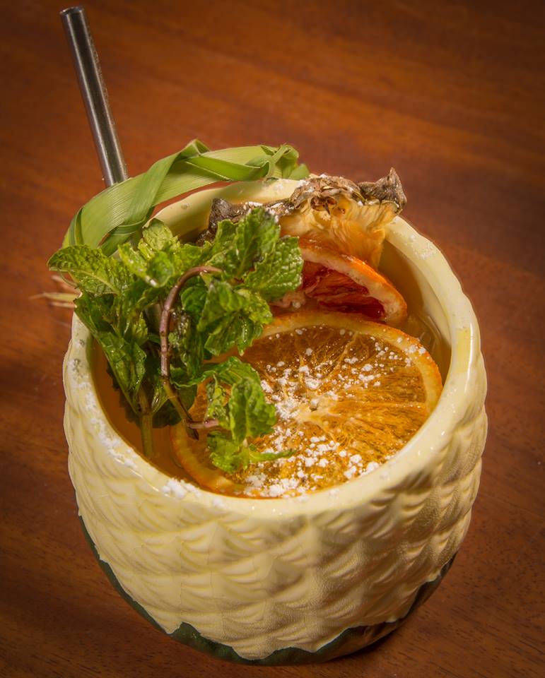 Add all ingredients to tin, add a small amount of crushed ice, whip and dump into vessel (half a tiki pineapple if available), add more crushed ice, give a little swizzle and top with crushed ice. Place dehydrated fruits and a fresh bouquet of mint on the side of the drink and finally, dust entire drink with white powdered sugar.
