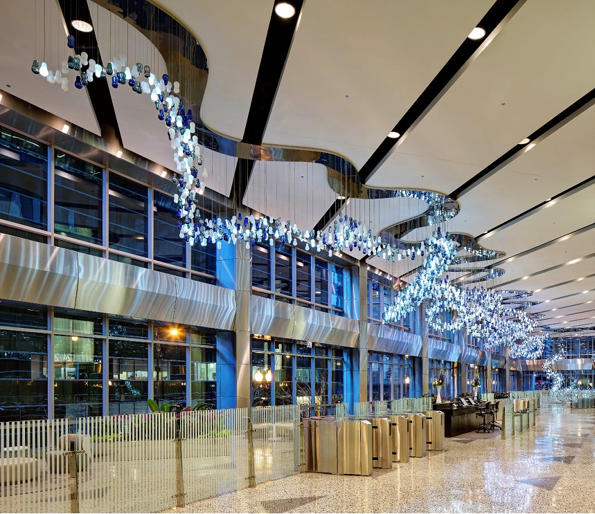 The bespoke design strives to perfect the transformation of glass to create a spectacular, emotive, lighting experience in the lobby. The unique piece emits a vibrant form of light to 540 West Madison lobby and mezzanine space.