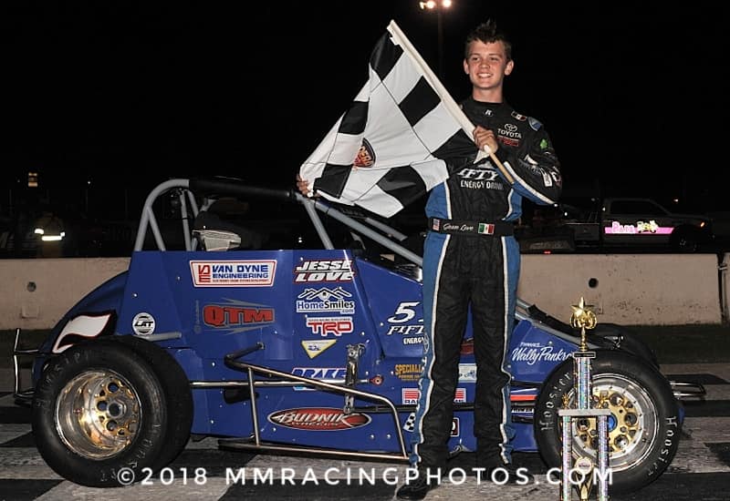 Love maintained the lead exiting turn two on the final lap and took to the bottom to defend against Nichols through turns three and four. Nichols never gave up, but as the cars crossed the stripe, it was Love in the lead – defeating the veteran Nichols and making history as the youngest ever full midget pavement feature winner.